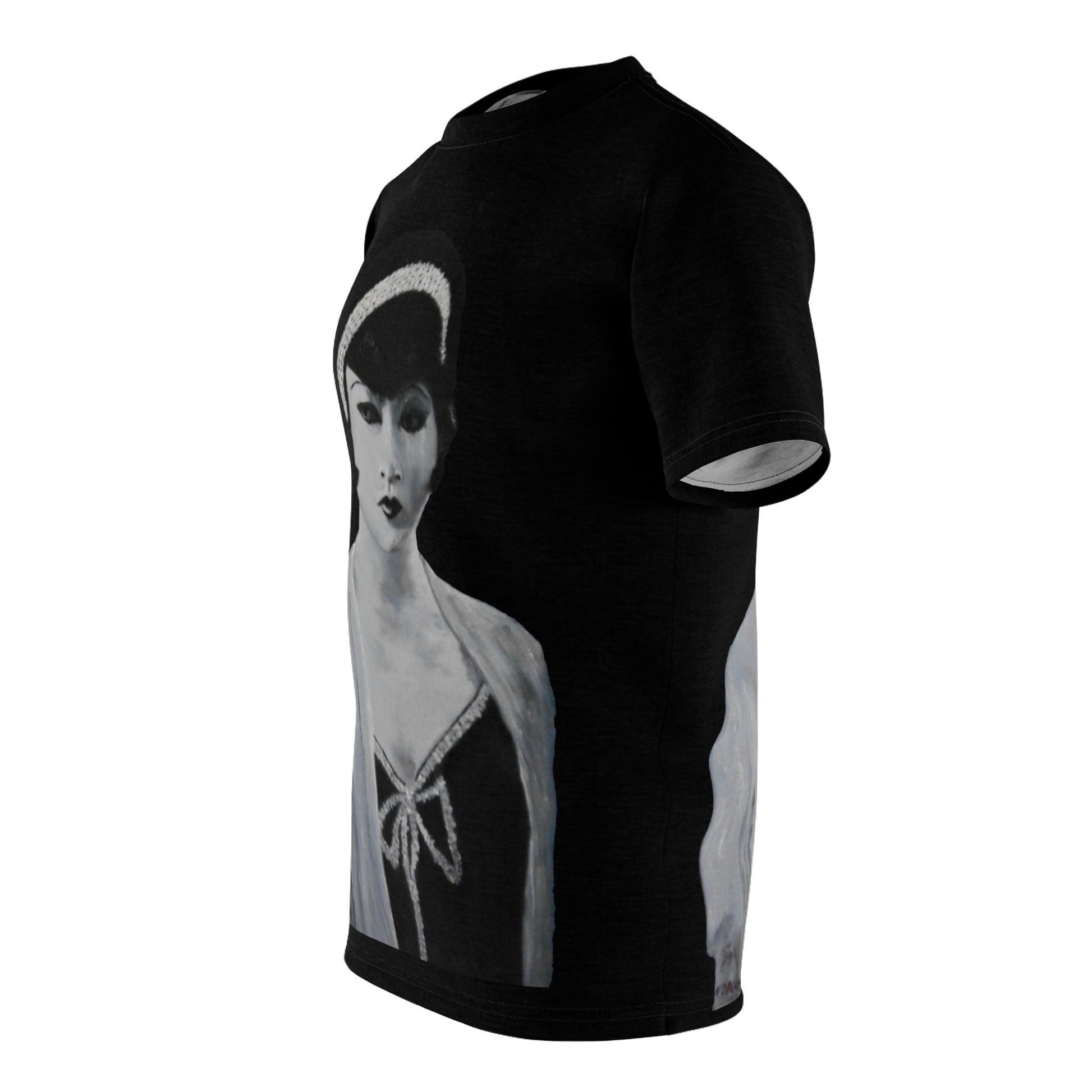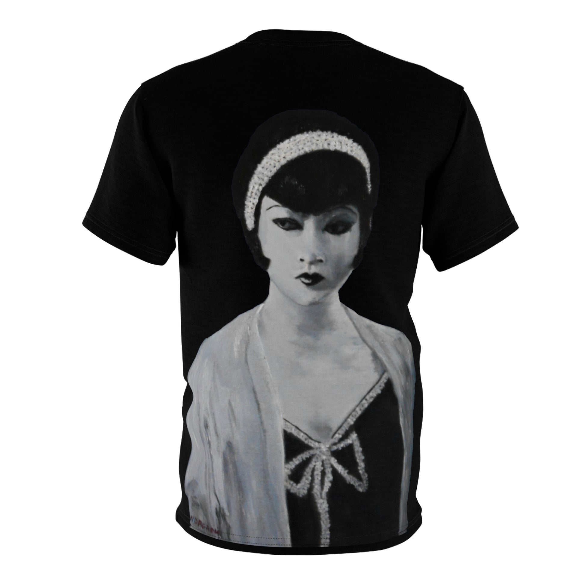 This elegant all-over print t-shirt features a portrait of Anna May Wong, the first Chinese-American film star of the 1920s, painted in a refined four-tone oil artwork by artist W-Dagrou. The image captures her poise and beauty in soft monochrome tones, enhanced by stylized contrasts and a minimal color palette — all key hallmarks of Art Deco portraiture. Set against a sleek black background, this piece blends old Hollywood charm with modern wearable art. A unique piece for lovers of vintage cinema, fashion history, and Asian-American cultural icons.