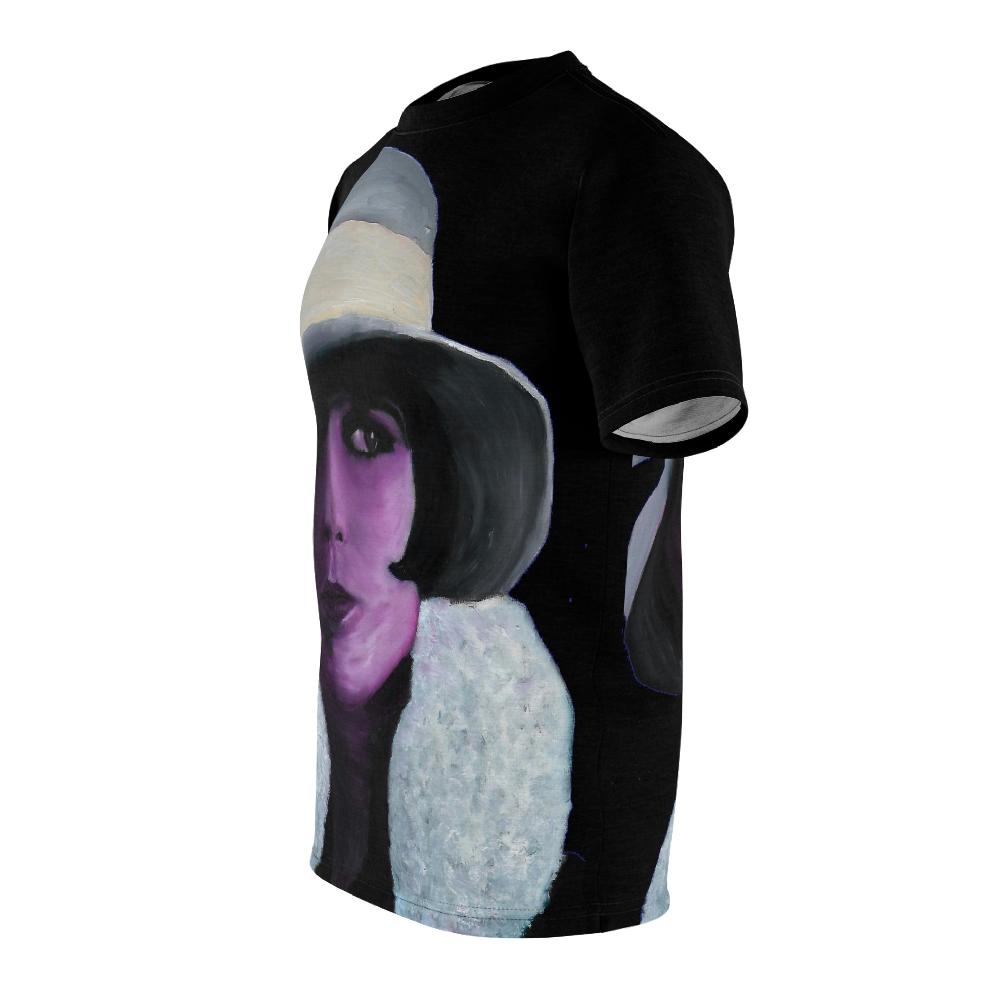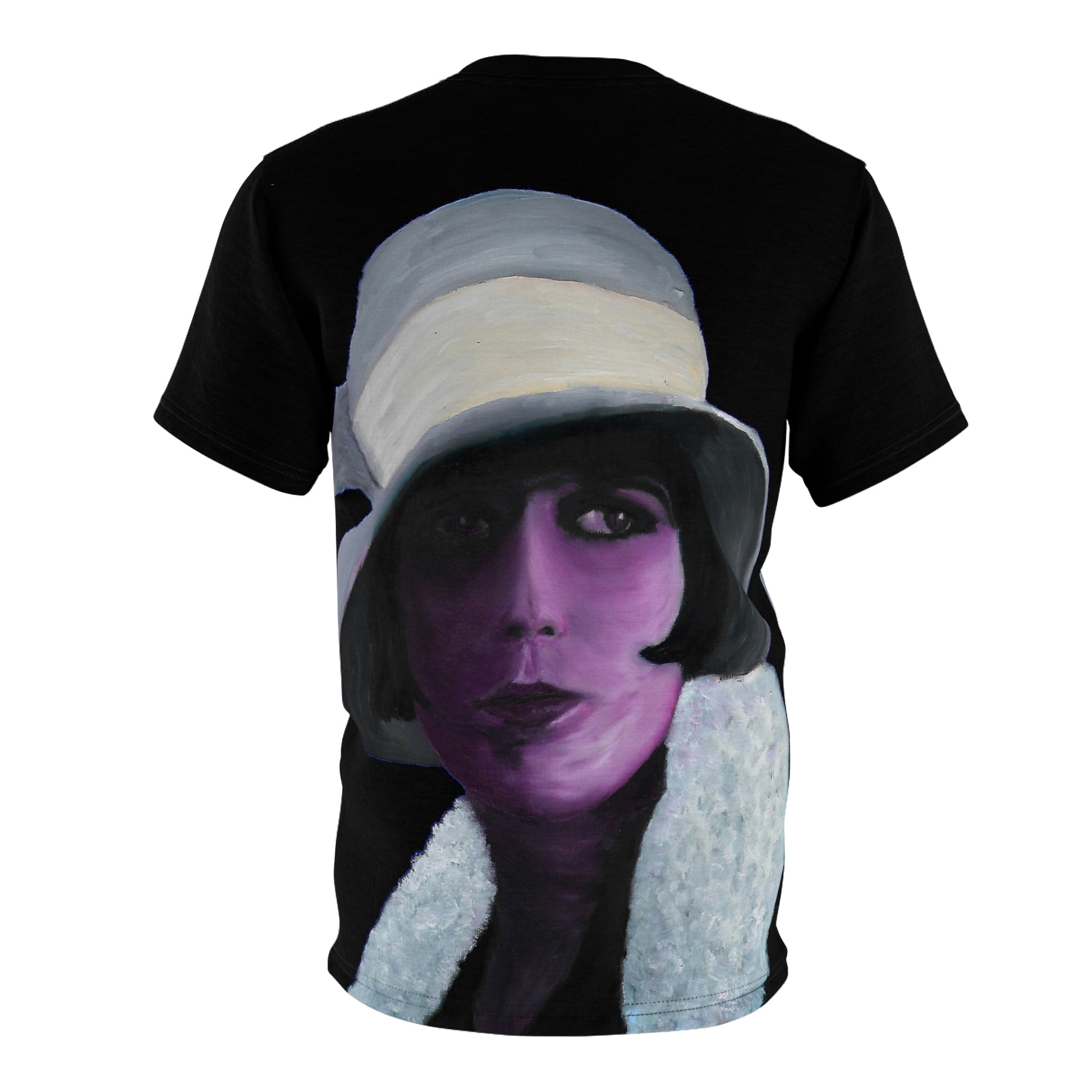 Celebrate the timeless elegance of 1920s Hollywood with this all-over print t-shirt featuring a powerful portrait of silent film icon Louise Brooks. Adapted from an original oil painting by W-Dagrou, the artwork blends bold brushwork with expressive shading and vivid purple tones. The black background adds intensity to the piece, enhancing the contrast with her white coat and defined gaze. This design evokes the Art Deco era through subject matter and mood rather than form, offering a sophisticated blend of vintage glamour and modern artistic flair. A perfect fit for retro fashion lovers, cinema fans, and those who appreciate wearable fine art.