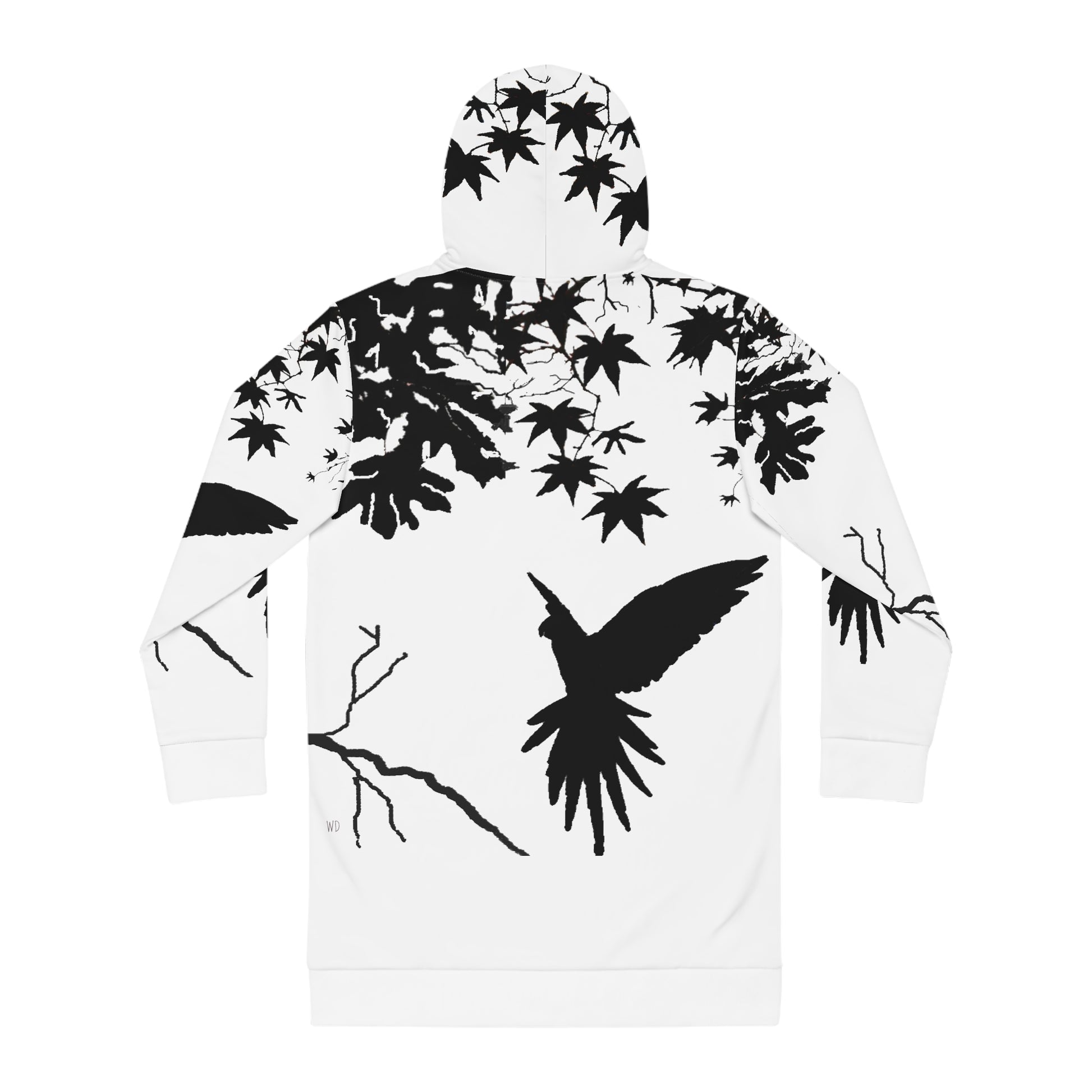 Find elegance in simplicity with the Women’s Hoodie Dress – Black Bird Serenity. Featuring the bold silhouette of a bird landing on a branch, framed by delicate Japanese-style maple leaves, this design captures the harmony between nature and movement. Set against a crisp white background, the high-contrast composition evokes peace, strength, and artistic refinement.