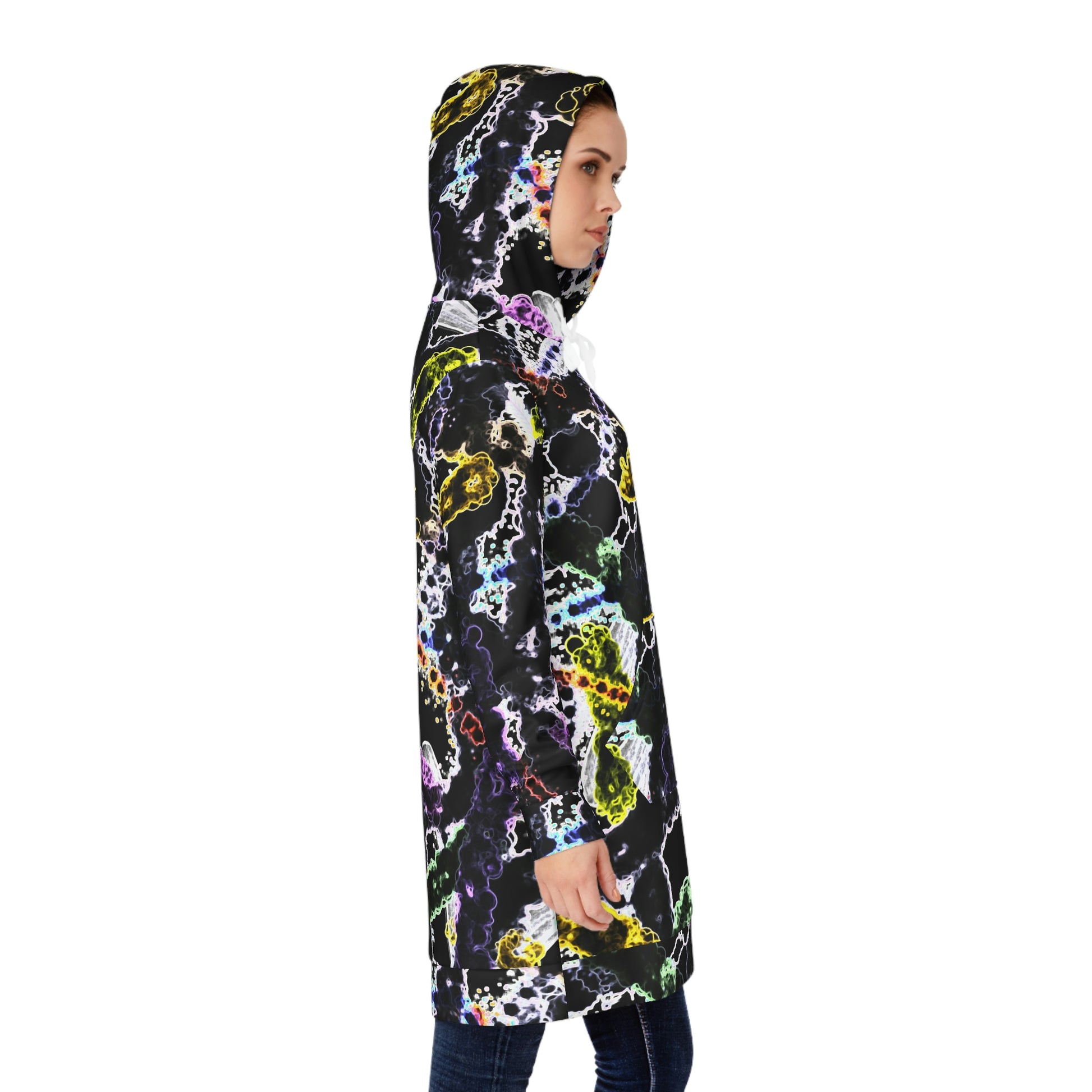 Step into bold creativity with the Women’s Hoodie Dress – Organisms. This unique design draws inspiration from the vibrant world of microscopic life, transforming hidden forms into a stunning piece of wearable art. Electric streaks of yellow, green, violet, and blue burst across a sleek black canvas, creating a powerful visual rhythm that feels both scientific and artistic.