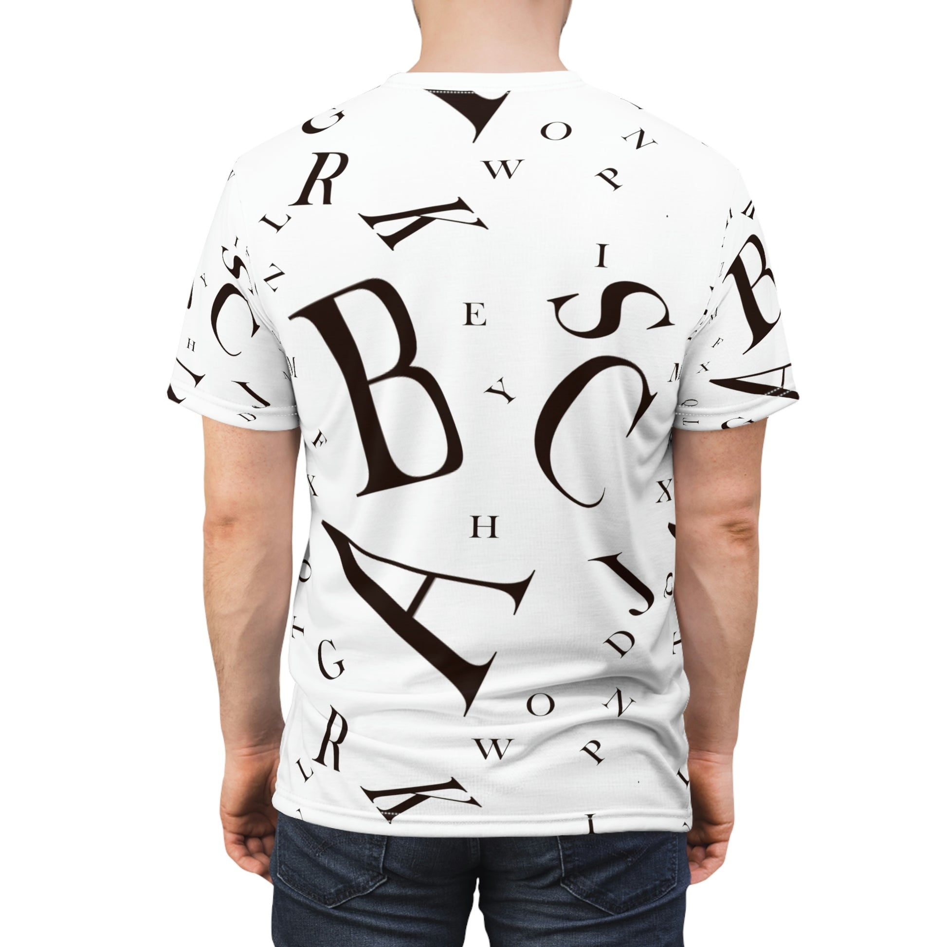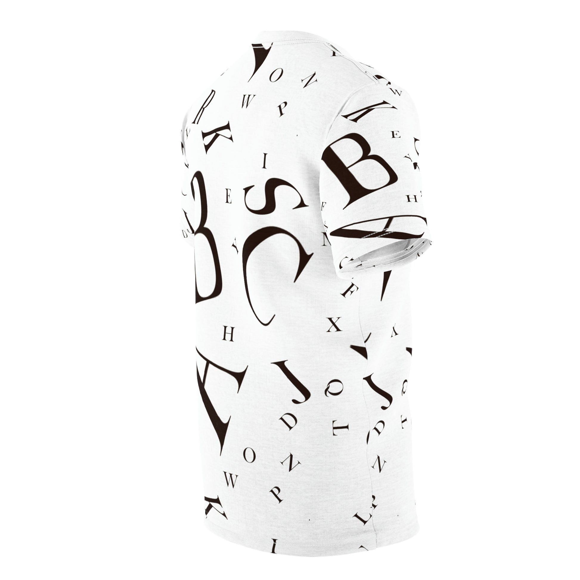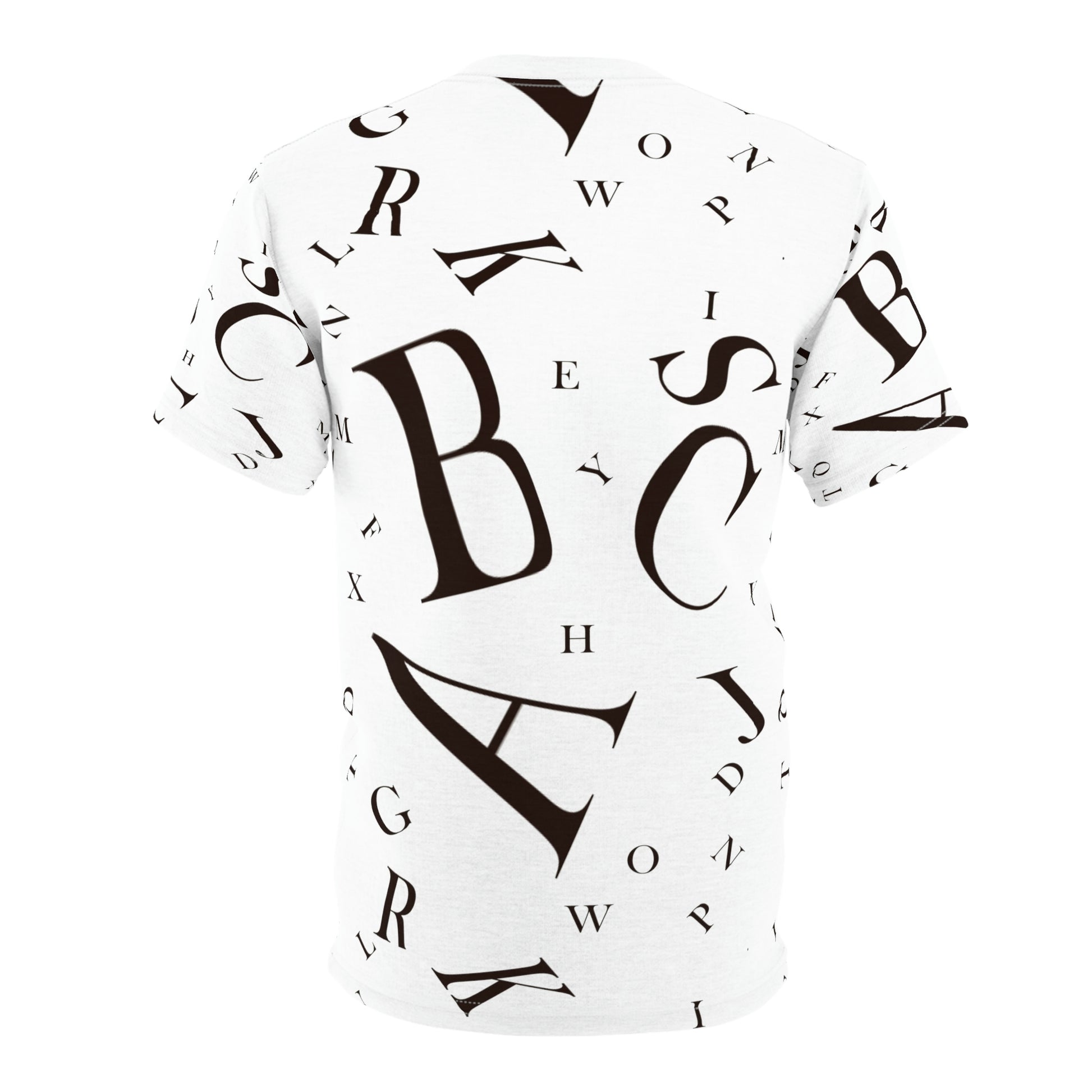 This eye-catching t-shirt features a scattered alphabet motif, with upper and lowercase serif letters floating in all directions across a clean white background. The black typography is both bold and minimalist, evoking a modern graphic style with vintage overtones. Perfect for lovers of typography, literature, and statement fashion, this unisex design is both playful and refined.