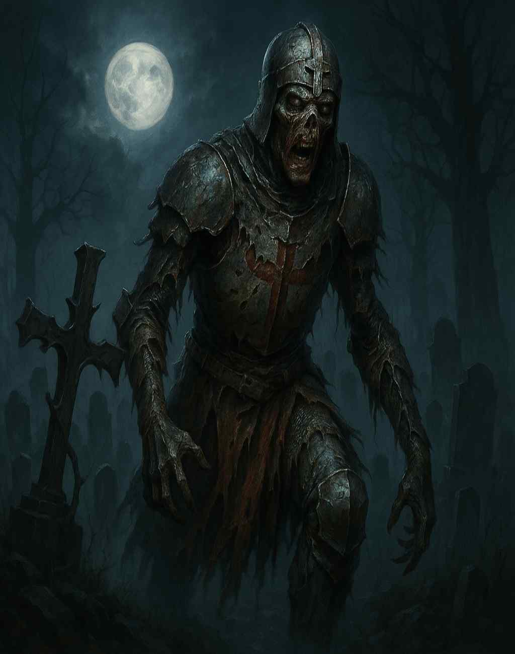 This cartoon-style masterpiece portrays a fallen Knight of the Temple, rising under the moonlight from an ancient battlefield. His armor is cracked, his blade rusted, yet his spirit endures — cursed to wander through time as a symbol of faith and vengeance. Perfect for Halloween or for fans of medieval fantasy and dark mythology.